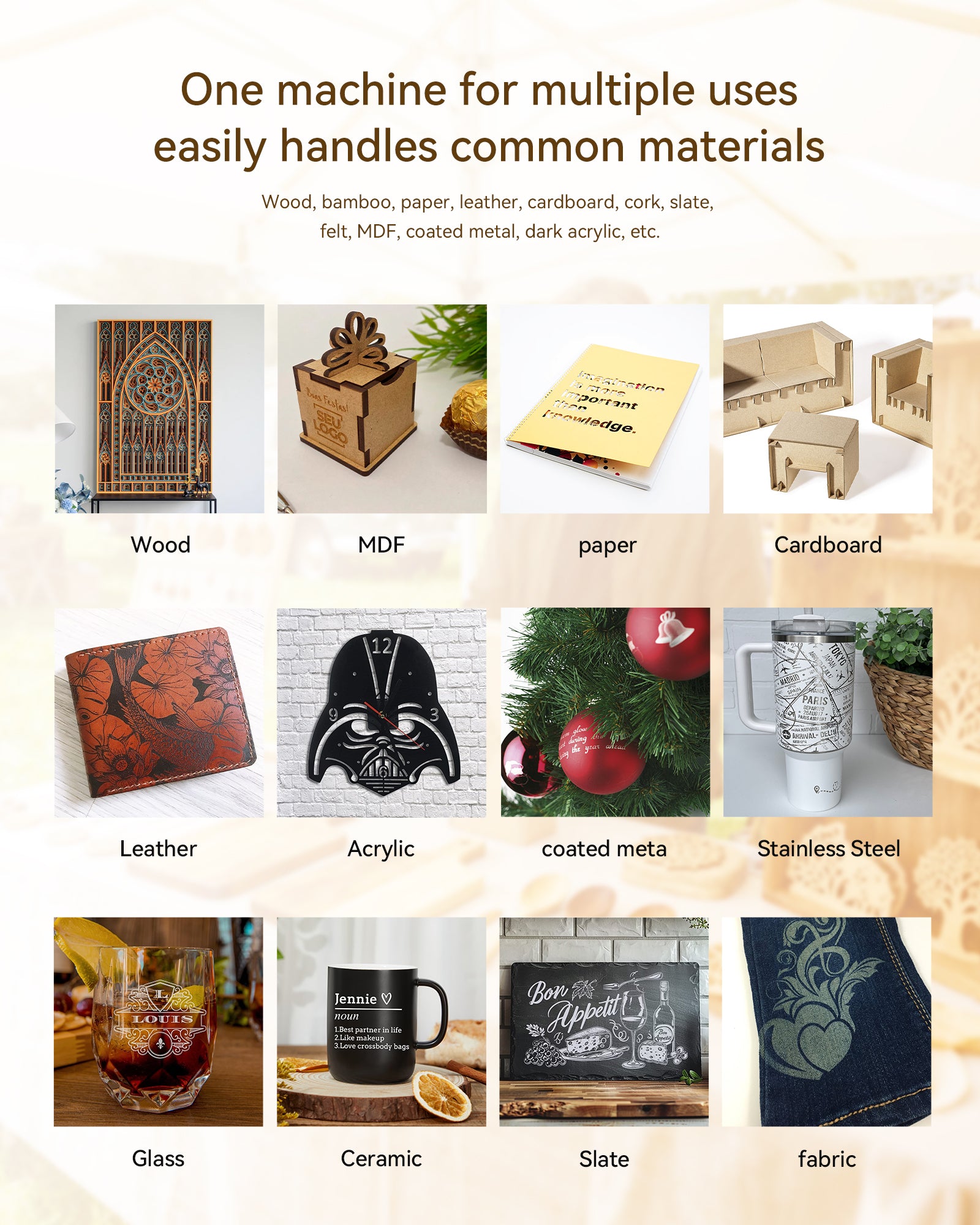 Compatible Materials: Wood, Bamboo, Paper, Leather,Cardboard, Cork, slate, Felt, Fabric, MDF, Coated Metals, Dark/opaqueAcrylic,etc.