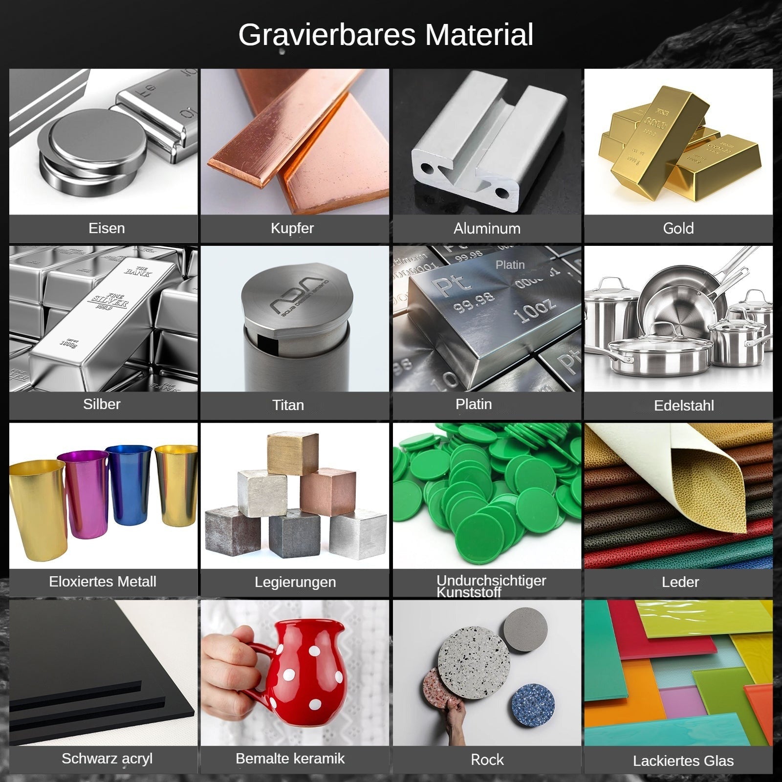 Gravierbare Materialien: PCB-Platte, Acryl, Aluminiumoxid, Beschichtung Schicht und Lackschicht Metall, 304 Spiegel Edelstahl, Glas, Keramik, Baumwolle, Schiefer, Leder;